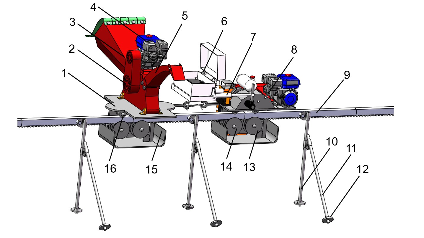 目前,丘陵山区果园输运系统一般采用绞轮式远程遥控单轨牵引车,横向尺寸小,对地面压迫小,受软质路面影响小;较履带式作业机械适应能力强,受坑洼路面影响小;较双轨牵引车占地面积小,布置更加灵活,但是功能比较单一,因此,团队基于远程遥控单轨输运系统,开发了一套丘陵山区果园枝条粉碎机。